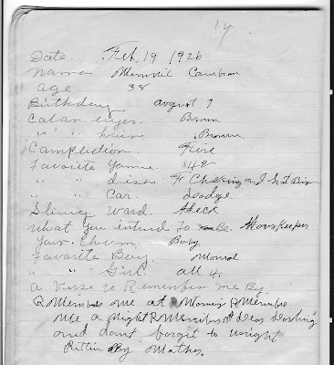 These are the thoughts of Fay Goodwin. Did you notice Fay is only 11 years old when she wrote this. There is several more pages of her friends, but the notebook is so old and fragile, the pages were too old to get a good picture.